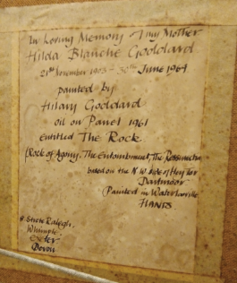 In January 1976 a painting was presented to the church by Hilary Goddard a former Sunday School teacher during the Ministry of the Revd Philippson. She was also an Art teacher and left the parish to live in Devon. The painting is of the North West face of Hay Tor on Dartmoor. It represents the Passion, Death and Burial of our Lord and also the glorious Light of the Resurrection.