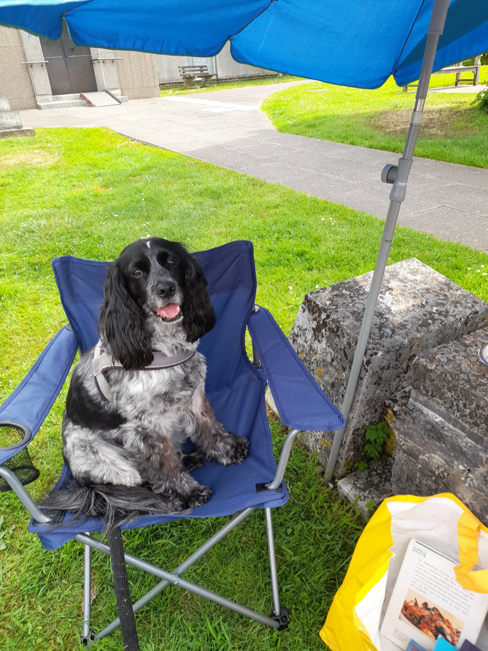 Alfreda helping out at the Friday morning Book Stall. After a busy morning supervising, a few moments rest under the shade of an umbrella on a comfy chair.