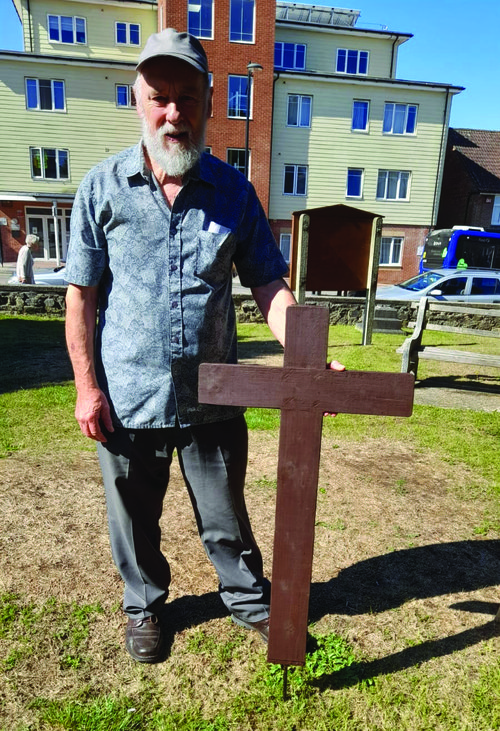 Malcolm Fremantle made this wooden cross ready for St. George’s for the remembrance garden. It will be covered with chicken wire and poppies attached to it.[Photo - Patricia Byrne]