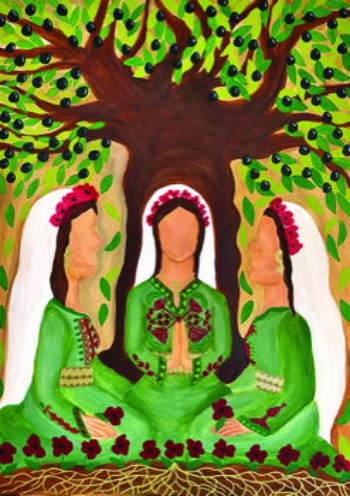 The artwork illustrated is by Halima Aziz (born in Hagen, Germany, in 1999), a passionate Palestinian visual artist and design student based in Germany. Her parents are from Tulkarm and Gaza and she grew up in Palestine. It shows three Palestinian women praying together in a peaceful, outdoor space and is aptly named ‘Praying Palestinian Women’. Halima has used motifs and symbols which indicate the origin and cohesiveness of these women: Olive trees are a sign of everlasting and abundant life because they can live for thousands of years. The Palestinian people are deeply rooted in their country and this is underlined by the golden roots of the tree. Poppy flowers are abundant and meaningful as they are a reminder of loved ones who have given their lives for their country. Traditional Palestinian dress such as the tatreez (embroidery), thobe (dress) or the white scarf symbolise the people’s creativity and their country’s rich heritage. The keys are a symbol of the hope to return back to Palestine.