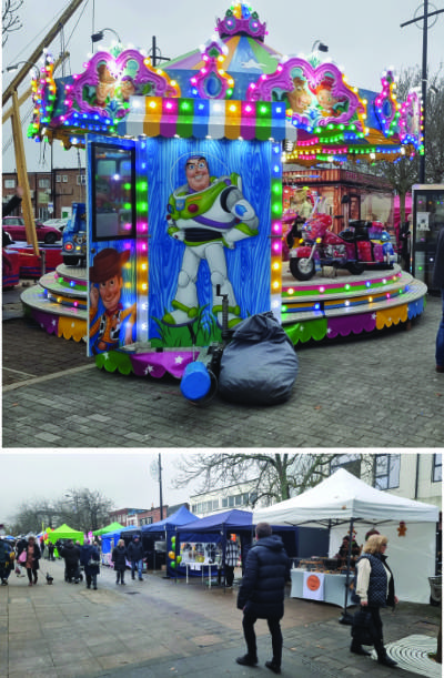 Then on Saturday 30th, a fabulous Christmas Market stretched the length of the Precinct, with attractions for the children such as the colourful roundabout pictured (right).