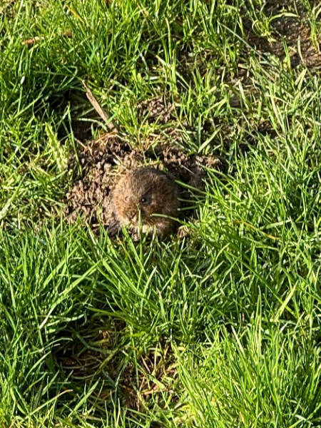 One photograph shows four of us with our catch at Meon Springs in February; the other was taken by David, who, while trying to land a trout, saw this delightful water vole peeping out of his burrow, and manged to photograph it with his other hand!