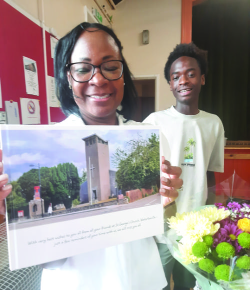 On Sunday 27th July we said a sad goodbye to Andrea, Tyler and Thomas. After two years as part of the St George’s family they are returning home to the Turks and Caicos. Fr Charles gave them a blessing and we put on wine and cake in the Hall after the service. Thanks to everyone who donated we bought an acrylic picture of the Spinnaker Tower and Harbour and a book of the History of Waterlooville to remind them of their time here. We also presented them with a photo book of events and people during their two years along with a voucher for The Exchange for them to enjoy a meal before they leave and a bunch of flowers. Andrea and children have been here for an extra year as Garvin had to return home to work. They have been a big part of life at St George’s joining in and helping at events, Andrea came to Walsingham with us in 2024, Tyler was confirmed at St George’s by the Bishop and Andrea took a big role in the organisation of The Dragons. They have extended an invite to anyone who would like to visit and are planning a holiday over here next year when they will visit St George’s.