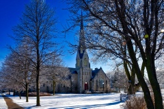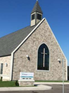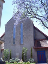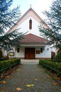 This is the Englische Kirche zu St. George Berlin, Germany. The original building was erected on Monbijou Park in 1885, but was destroyed in the allied Bombing of Berlin in World War II. The site happened to be in what had become the Soviet sector of Berlin in 1945 and was therefore abandoned and the ruins removed in 1949. In 1950 the congregation built a new church on the corner of Preußenallee and Badenallee in Neu-Westend, part of the Westend locality of Berlin in the British sector. The church served as the garrison church of the British Army during the Allied occupation.