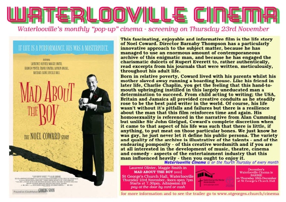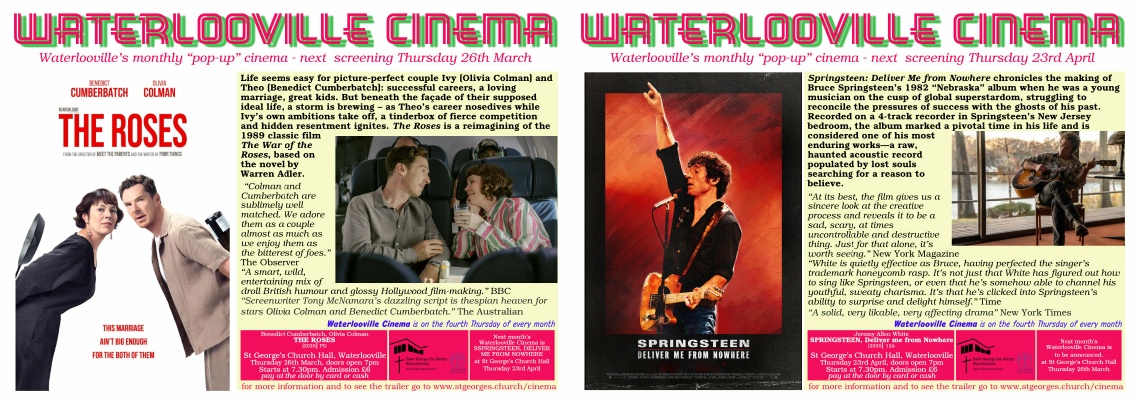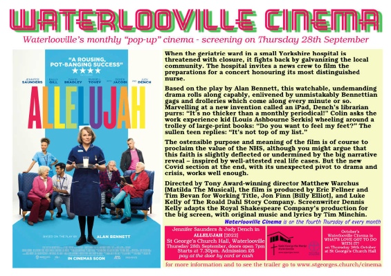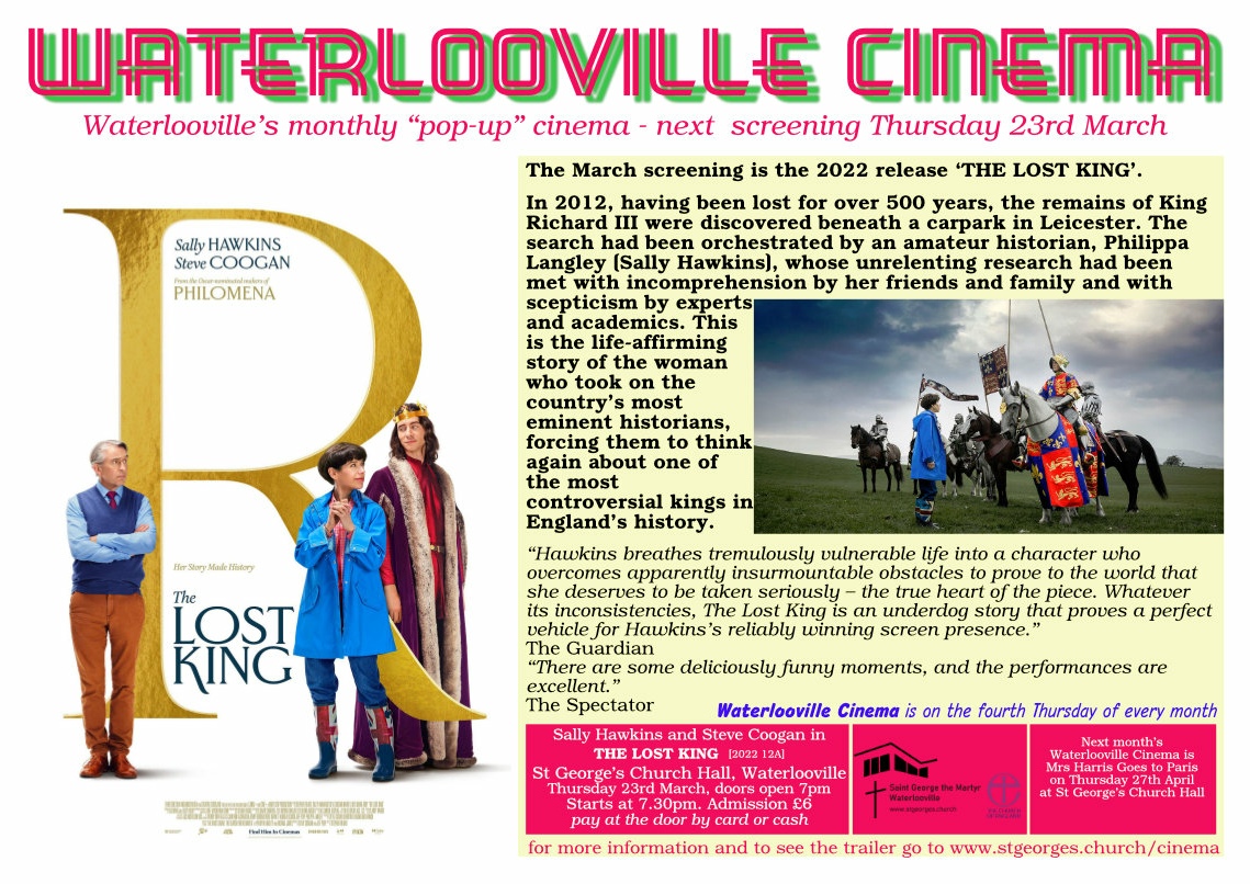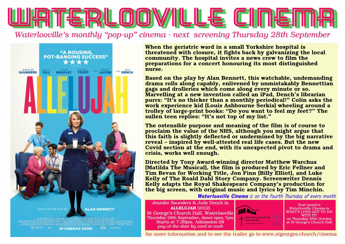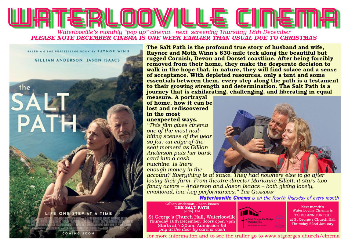Waterlooville Cinema is a monthly ‘pop-up’ cinema bringing the latest blockbuster films to the town on the 4th Thursday of every month. The next screening is on Thursday 18th December, doors open 7pm for a 7.30pm start. Tickets (on the door) £6. Pay by card or cash.