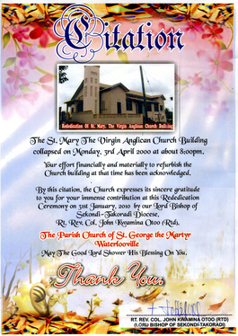 Citation given at the Rededication Ceremony, on the 31st January 2010, by Lord Bishop of Sekondi-Takoradi Diocese, the Rt Rev Col John Kwamina Otoo (Rtd), to acknowledge the financial help given to St Mary’s Axim by St George’s Church, in the project to rebuild the St Mary’s church building following its collapse on Monday 3rd April 2000.