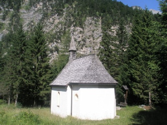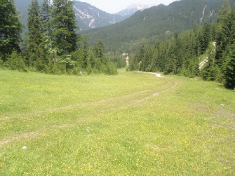 Leaving the church behind I continued downhill through the woods until I came to a river, which I followed for a couple of miles and sometimes on a small road which ran alongside the river. Then I came across a bridge and was able to cross and get back into the woods on the far side, following the track which ran parallel with the river for a mile or so until reaching the outskirts of Ehrwald, where I stopped for coffee and some more Apple Strudel, before heading back across the meadows to the camp site.