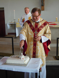 At the end of the service a cake, made and decorated by Eve Inwood, was brought forward for the Bishop to cut, and we all went over to the Hall to enjoy a piece with our wine or coffee. Bishop Christopher spent time talking to people in a relaxed atmosphere before having to leave, no doubt for other engagements.