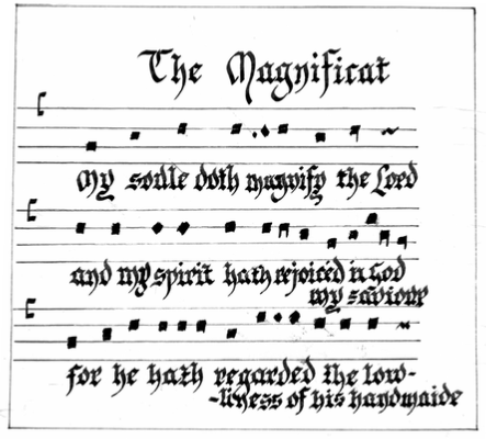 The music was tuneful and easy to sing, derived from a simplified version of Gregorian Plainchant. It was written on a four-line stave, based on the breve and tolerant in its use of measure. In addition to the Communion Service, a considerable amount of music was provided by Merbecke - for Psalms, Canticles, Versicles and Responses and other renderings, including, as the illustration shows, the Magnificat.