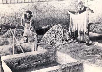 A tanner takes the raw, untreated hide or skin from the abattoir and converts it into leather. In the 19th century this was done by first loosening the hair using lime and sulphide, scraping it off, then immersing in vegetable extracts. The tanner would dry the treated hide which was then in a rough preserved condition.
